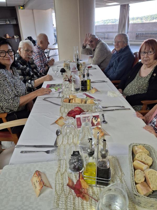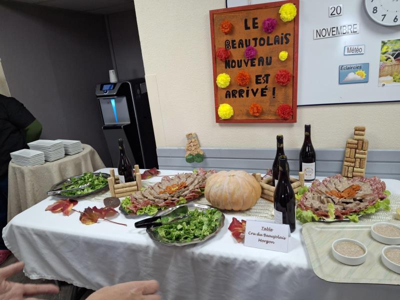 Le repas du Beaujolais s'est déroulé dans une ambiance chaleureuse et conviviale au sein de l'EHPAD. Les résidents ont apprécié ce moment festif, qui a permis de partager un repas typique autour du Beaujolais nouveau.