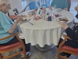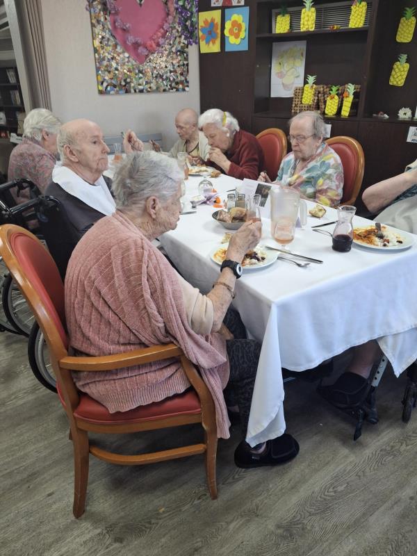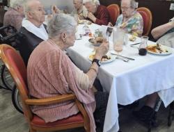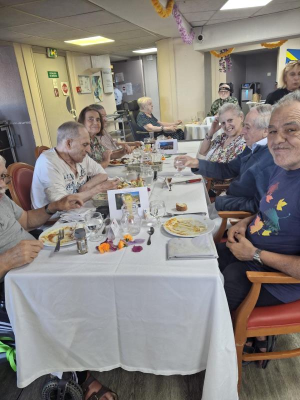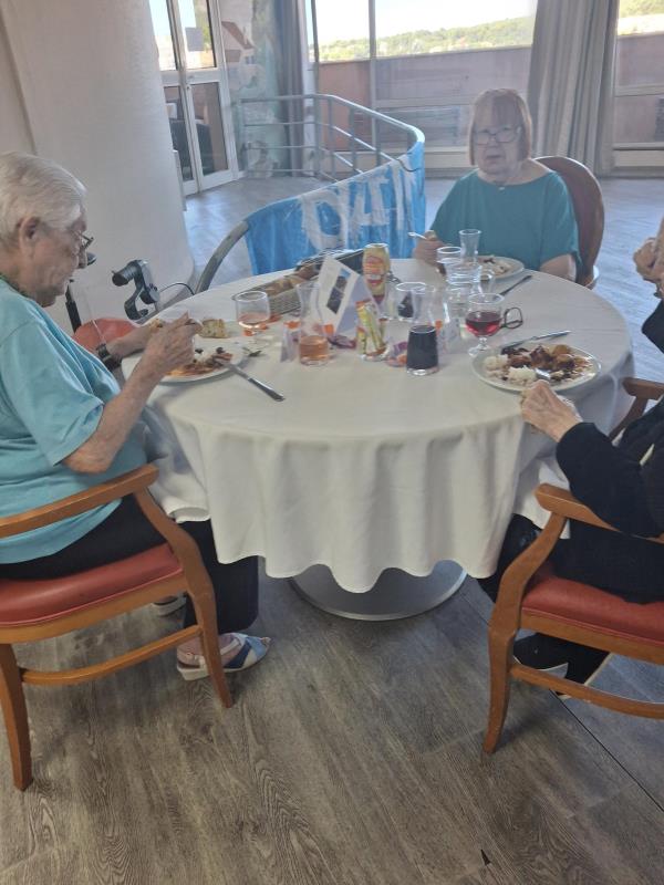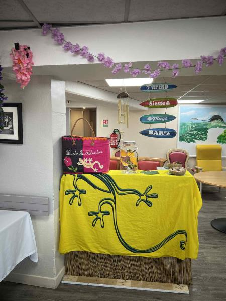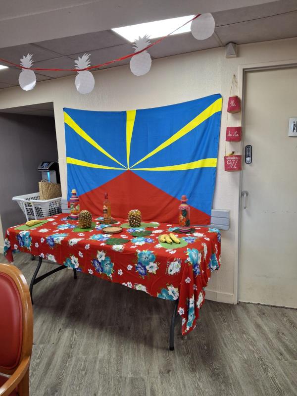 Aujourd'hui, les résidents ont voyagé à travers les saveurs de l'île de la Réunion lors d'un repas à thème festif et coloré. La salle à manger était décorée aux couleurs créoles et accompagnée de musiques traditionnelles. Le menu proposait des nems en entrée, rougail saucisse, riz, haricot rouge et en dessert un excellent gâteau patate douce.